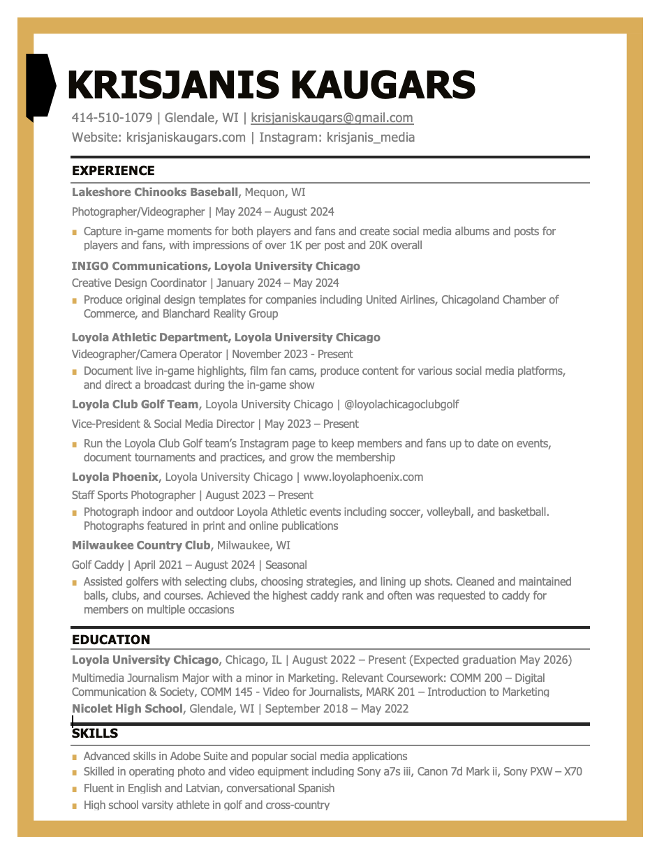 Kaugars is passionate about storytelling through visuals, aiming to create impactful content that elevates the athlete experience. He is set to graduate from Loyola University Chicago in May 2026 and looks forward to pursuing a career in sports media and creative content production.